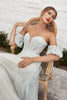 Prepare to be captivated by this enchanting gown adorned with an exquisite spectacle of intricate lace and delicate beadwork. The mesmerizing display begins with an alluring plunging sweetheart neckline, accentuated by a graceful sheer inset that adds an element of mystique. Detachable puff sleeves gracefully enrobe the arms, evoking a sense of regal charm and sophistication.