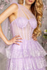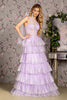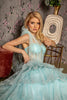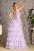 The tiered skirt flows effortlessly in an A-line silhouette, adorned with cascading ruffles that add a touch of feminine flair. Shimmering glitter embellishments dance across the fabric, ensuring you shine all night long. Make a statement and leave a lasting impression in the GLSbyGloria GL3454 dress, available in enchanting Baby Blue and Lilac hues.