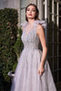 Step into the spotlight with grace and beauty in the enchanting Cinderella Divine B704 evening dress. This sleeveless gown is a vision of elegance, featuring an illusion jewel neckline that seamlessly transitions into a flattering V-neckline. The bodice is adorned with intricate embroidered patterns, adding a touch of sophistication to the design. Feathered thin shoulder straps provide delicate support while framing the full sheer back, creating a matching and elegant look. The center zipper ensures a secure fit, while the A-line sheath skirt, fully lined in sparkling tulle for modesty, flows gracefully to a full-length hem. Prepare to capture the essence of a romantic evening in this exquisite Cinderella Divine piece, whether it's prom, bridesmaid, Mother of the Bride, or a special night out. This gown is the epitome of elegance and style.