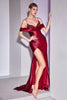 Prepare to captivate in the enchanting Cinderella Divine CC2197 gown. Crafted from smooth satin, this exquisite creation boasts a tailored silhouette that beautifully enhances your curves. The attention-grabbing bejeweled bustier is elegantly suspended from delicate spaghetti straps, adding a touch of glamour to the ensemble. Off-shoulder straps adorned with foldover accents lend an extra layer of sophistication. The skirt drapes gracefully and features a high slit that enhances the sheath silhouette, while a sumptuous train adds a touch of drama to your stride. As you ascend to the height of chic fashion, this Cinderella Divine gown guarantees a captivating presence that will have all eyes fixed upon you.
