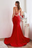 Unleash your inner goddess in this ethereal Cinderella Divine CD2219 gown. Its meticulous tailoring effortlessly contours to your body, accentuating your statuesque beauty. The tank straps lead to a plunging scoop neckline, while the mesmerizing open back captivates with intricate strap details. The elegantly tailored skirt flows gracefully into a mermaid silhouette, creating a gentle train that adds a touch of drama to every step. Experience the epitome of elegance and sophistication in this exquisite masterpiece.