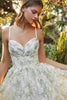 Immerse yourself in the captivating allure of this exquisite gown. Its delicate organza silhouette adorned with an enchanting floral print exudes elegance and sophistication. The pleated sweetheart neckline suspended from delicate spaghetti straps adds a touch of refinement, while the corset-style back woven with thin straps creates a unique and alluring effect. The skirt flows gracefully from a shirred waistline, cascading to the floor in a sweeping and enchanting manner, leaving a lasting impression on all who behold it.