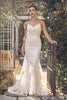 The floor-length fitted mermaid skirt gracefully highlights your figure, flowing into a sweeping train that leaves a trail of enchantment in your wake. Noteworthy details include built-in bra cups and a fully lined interior, ensuring both comfort and confidence throughout the occasion.