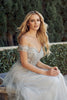 Embrace elegance and sophistication in this stunning off-the-shoulder prom dress from Enchanted Dreams. The intricate lace bodice, adorned with exquisite floral embroidery, creates a captivating focal point. The flowy A-line skirt cascades gracefully, enhancing your feminine curves. The delicate beading along the neckline adds a touch of shimmer, while the adjustable spaghetti straps ensure a perfect fit. Whether you're attending prom, a formal event, or a special occasion, this dress will make you the center of attention. Its timeless design and impeccable craftsmanship will leave an unforgettable impression.
