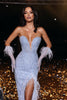 * Mermaid silhouette with feather-fringed slit and sweeping finish