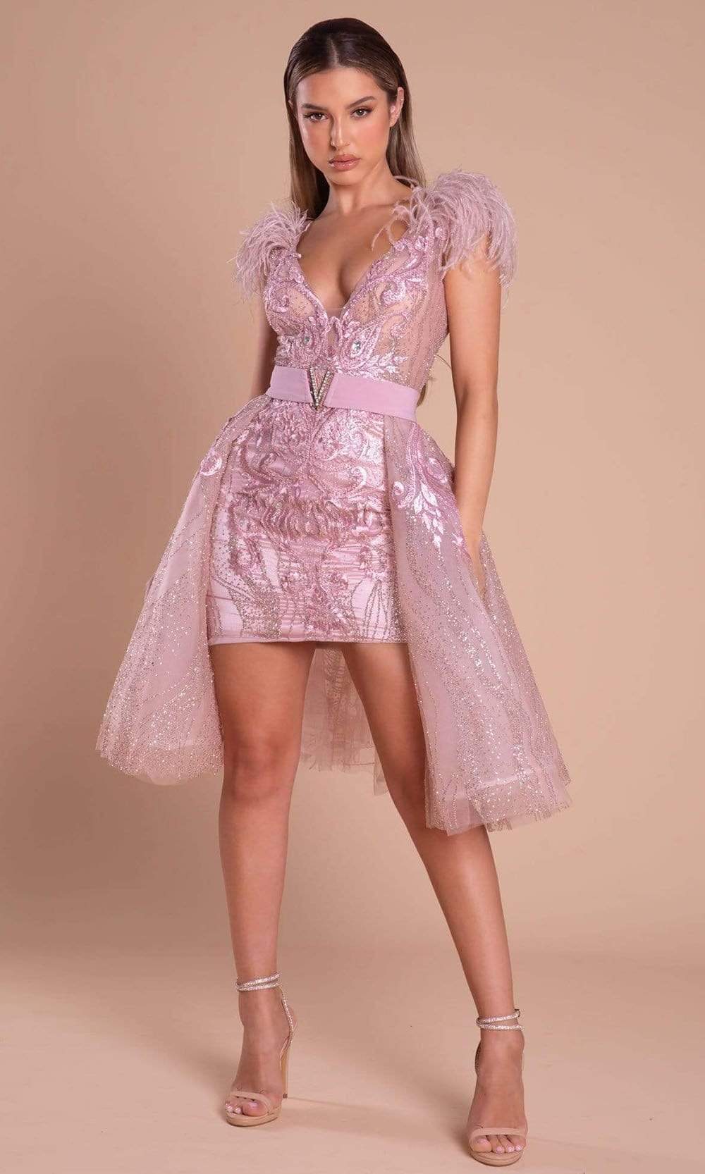Immerse yourself in the epitome of luxury and elegance with the Portia and Scarlett PS21101 dress. This exquisite gown captivates with its deep V-neckline and form-fitting bodice, cinched at the waist by a stylish waistband. The shoulders are adorned with intricate feather detailing, making this dress a true showstopper. The skirt is tailored to hug your curves in a mid-thigh fitted silhouette, enhanced by a mesmerizing overskirt that adds an element of drama and glamour. Step into the spotlight and make a statement in this fashionable and unforgettable design by Portia and Scarlett.