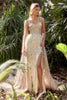 Indulge in the ethereal beauty of this Enchanting Eve gown. Its sheer bustier bodice, adorned with corset boning accents, creates an alluring and structured appeal. The sleeveless design and open back add to the captivating look. The opulent skirt unveils a sleek sheath silhouette, while a gossamer overskirt gracefully originates from the waist, adding an ethereal touch that enhances the ensemble's charm. Perfect for formal events, weddings, proms, and special occasions where you desire to make a statement of elegance and sophistication.