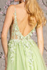 Prepare to captivate every gaze in the mesmerizing GLS by Gloria GL3202 evening gown. Its plunging V-neckline draws attention to your décolletage, while the fitted bodice accentuates your curves with boning, a sheer inset, and supportive spaghetti straps. The back reveals an alluring V-design, secured by an elegant zipper closure. The A-line skirt flows gracefully, featuring a high slit that adds a touch of allure. Intricate floral appliqués and sparkling beads adorn the gown, elevating its glam factor. Available in a vibrant L Green hue, this GLS by Gloria masterpiece exudes confidence and charm, ensuring you steal the spotlight wherever you go.