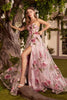 Indulge in the ethereal beauty of this exquisite gown by Enchanting Eve. Crafted in a strapless sweetheart neckline, it exudes allure with its corset lace-up back, infusing a touch of sultriness into the design. Adorned with an enchanting organza floral print that gracefully spans the dress, it captures attention effortlessly. The strapless bodice, boasting an A-line silhouette, descends gently to a floral-adorned feature accentuated by charming flowers. Enhanced by a side slit that elegantly complements the full-length hem, the dress culminates in a subtle sweeping finish, adding to its undeniable beauty.