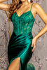 Elevate your style to new heights with the captivating GLSbyGloria GL3439 evening gown. This exquisite creation features a flattering V-neckline that draws attention to your décolletage. The illusion bodice hugs your curves perfectly, while boning and spaghetti straps provide support and comfort. The mid-open back showcases a charming lace design, adding a touch of sophistication. Intricate embroidery and sequins adorn the bodice, creating a mesmerizing effect. The sheath skirt with draped hips and a sultry high slit flows elegantly to the floor, accentuating your silhouette. Available in a captivating array of hues, including Fuchsia, Green, Navy, and Smoky Blue, this GLSbyGloria masterpiece is sure to make a lasting impression at any formal occasion.