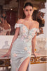 Step into a realm of enchantment with this captivating off-the-shoulder floral appliqué gown. Its mint hue exudes a refreshing elegance, while the intricate floral appliqués in soft pink create a mesmerizing symphony of colors. The fitted silhouette accentuates your curves, ensuring a flattering fit that allows for effortless movement. The sheer boned bodice provides both support and a tantalizing glimpse of skin, while the leg slit adds a touch of allure. The tulle overlay adds a layer of ethereal beauty, making this gown the perfect choice for any formal occasion. Whether you're attending a wedding or hosting your own soirée, this gown is destined to make you the center of attention.