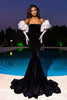 Prepare to steal the spotlight in this captivating Portia and Scarlett PS23039 creation. This glamorous strapless gown effortlessly flatters your curves with its princess seams and chic straight-across neckline. For a versatile two-in-one look, it comes with detachable puffed sleeves and matching gloves that add a touch of drama. The mermaid skirt gracefully skims your figure before flaring out into a floor-length hem complete with a dramatic sweeping train. Choose the alluring Black color and become the center of attention in this unforgettable gown from Portia and Scarlett PS23039.