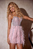 Indulge in an unforgettable sensation with this captivating short dress by Portia and Scarlett. The sweetheart neckline accentuates your femininity, while the sheath silhouette elegantly showcases your curves. The daring plunge of the sheer top, delicately held by spaghetti straps, creates a tantalizing effect. The cinched corset-style bodice beautifully accentuates your waist. Embellished with shimmering sequins and intricate beadwork, this dress sparkles with every step you take. The feathered skirt infuses a playful touch and adds movement, making it the ideal choice for a memorable night out. Turn heads and leave an impression with this lavish dress available in Pink and Purple colors.