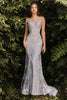 Step into the spotlight with the ethereal Cinderella Divine J810 Evening Gown. This masterpiece exudes pure glamour with its shimmering sequins and delicate sheer overlay. The corset-style bodice accentuates your curves, while the V-shaped back and center zip-up closure provide a touch of allure. The mermaid skirt hugs your figure before flaring out gracefully with Godets, creating a captivating silhouette that flows into a sweeping train. Whether you're attending a prom, pageant, or black-tie event, this Cinderella Divine gown will turn heads and leave an unforgettable impression.