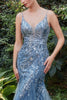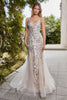 Immerse yourself in the ethereal beauty of this meticulously crafted gown. Its silhouette is adorned with a mesmerizing interplay of sequins and lace appliqués, resembling a trailing foliage motif. The bodice exudes elegance with its slender spaghetti straps and plunging V-neckline, accentuated by an illusion inset for a hint of allure. The back features a deep V-shaped open design, adding a touch of daring charm.