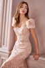 Indulge in the timeless allure of this enchanting extended gown. Its semi-sweetheart neckline and charming short puffed sleeves exude a touch of femininity and grace. The figure-hugging mermaid silhouette accentuates your curves, creating a captivating silhouette. The sweeping train adds a touch of drama, while the V-cut back adds a hint of allure. This exquisite gown embodies a harmonious blend of femininity, confidence, and regal splendor, making you feel both captivating and commanding.