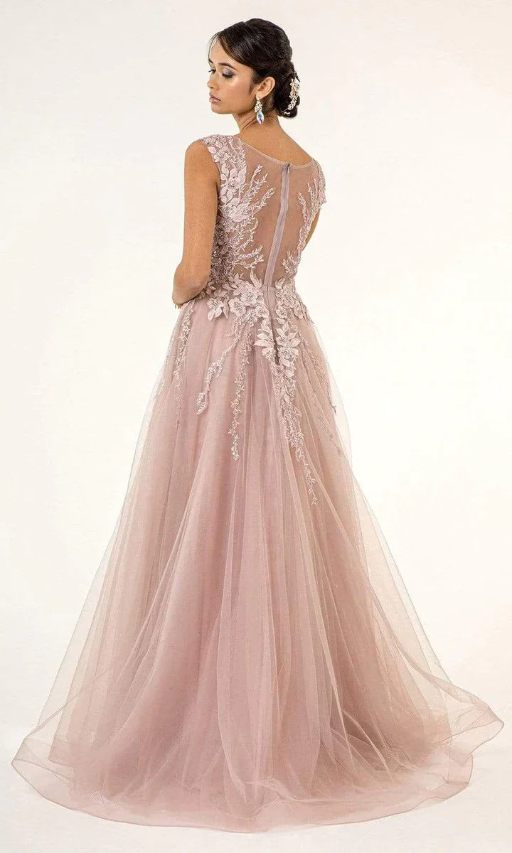 Prepare to be the epitome of grace and sophistication in this captivating GLS by Gloria gown. Its exquisite floral embroidery, adorned with shimmering beads and sequins, creates a breathtaking visual masterpiece. The illusion jewel neckline and back add an ethereal touch, while the cap sleeves lend a delicate elegance. The lavish ornate skirt flows effortlessly into a dramatic train, leaving an unforgettable impression. This Elizabeth K creation exudes an aura of timeless elegance and sophistication that will command attention and admiration wherever you go.