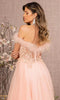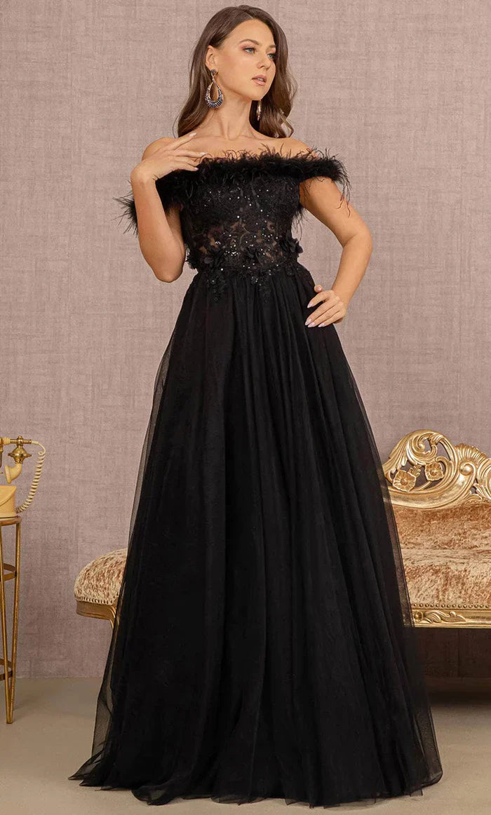 Step into the spotlight in the captivating GL3138 dress from GLS by Gloria. This off-the-shoulder gown boasts a stunning corset bodice embellished with intricate appliqués, delicate 3D floral details, and shimmering sequins. The straight-across neckline exudes elegance, while the feathered trim adds a touch of whimsy. The floor-length A-line skirt flows gracefully with a high slit and subtle train, creating a silhouette that is both alluring and sophisticated. Available in Black or Blush, this glamorous and romantic dress is sure to leave a lasting impression at any special occasion. Embrace the spotlight and turn heads with the GL3138 dress by GLS by Gloria.