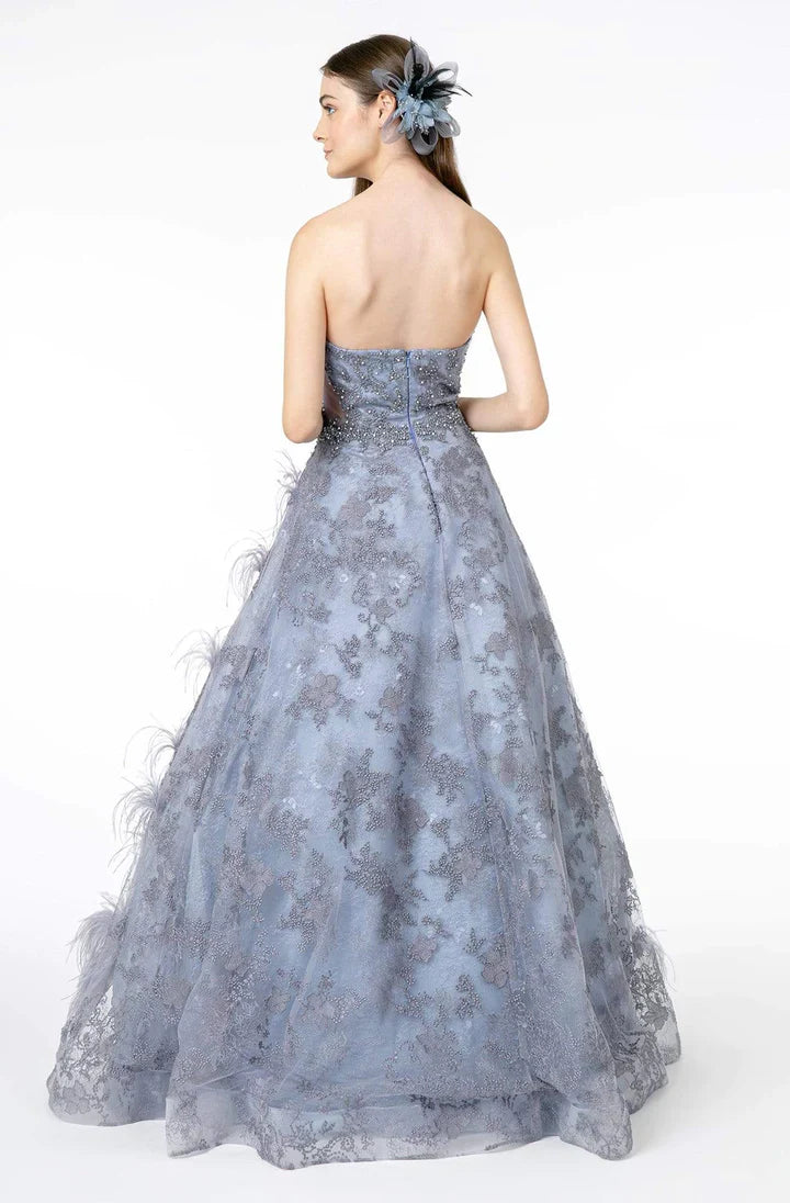 Step into the spotlight in this mesmerizing GLS by Gloria gown. Its exquisite sequin lace appliques and ethereal feather details create a breathtaking visual masterpiece. The sweetheart neckline and strapless bodice accentuate your décolletage, while the mid-open back adds a touch of allure. The ball gown skirt billows gracefully to a full-length hemline, ensuring an unforgettable entrance. With its impeccable craftsmanship and attention to detail, this GLS by Gloria gown will make you the center of attention at any special occasion.