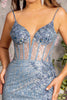 Indulge in the ethereal beauty of the GLS by Gloria GL3266 gown. Crafted from exquisite mesh fabric, this masterpiece exudes luxury and sophistication. The sleeveless corset bodice features intricate jewel and bead embellishments, radiating a captivating aura. Dainty spaghetti straps and an open back adorned with a lace-up tie and central zipper closure ensure a perfect fit. The mermaid skirt cascades elegantly to the floor, boasting a ruched back detail and a tantalizing slit for added allure. A graceful train completes the ensemble, adding a touch of timeless elegance. Available in a mesmerizing Smoky Blue, the GLS by Gloria GL3266 effortlessly blends contemporary allure with classic sophistication, ensuring an unforgettable presence at any special occasion.