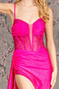Embrace the epitome of elegance and allure in the GLS by Gloria GL3260 evening gown. This exquisite creation features a captivating sweetheart neckline adorned with delicate spaghetti straps. The sheer bodice showcases an alluring inset, intricately embellished with shimmering beadwork. The back boasts a stylish crisscross design, secured with a concealed zipper closure. A high-high slit on the floor-length sheath skirt adds a touch of allure, complemented by a sweeping train that exudes sophistication. Available in captivating Fuchsia and Royal Blue hues, this gown is the perfect choice for making a grand entrance at any formal occasion.