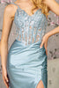 Step into the spotlight with the alluring GLS by Gloria GL3439 evening gown. Its exquisite design features a flattering V-neckline and a figure-hugging illusion bodice that showcases your curves. The intricate embroidery and sequins add a touch of glamour, while the mid-open back with delicate lace detailing adds a touch of sophistication. The sheath skirt with draped hips and a sultry high slit creates a captivating silhouette that flows effortlessly to the floor. Available in a range of hues including Fuchsia, Green, Navy, and Smoky Blue, this GLS by Gloria masterpiece is sure to make a lasting impression at any special occasion.