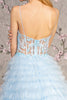 Prepare to turn heads at any special event with the mesmerizing GLSbyGloria GL3464 gown. This exquisite sleeveless dress features a sheer corset bodice that cinches the waist, creating a flattering silhouette. The sweetheart neckline is adorned with intricate embroideries, adding a touch of timeless charm. The back boasts a central zipper closure for a secure fit. The floor-length A-line silhouette flows gracefully, adorned with a ruffled skirt that adds a touch of modern elegance. Available in a captivating Baby Blue hue, this gown effortlessly combines timeless allure with modern sophistication.