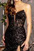 Indulge in the captivating allure of the GLS3315 evening gown from GLS by Gloria. This exquisite masterpiece boasts a strapless sweetheart neckline that elegantly frames your décolletage. The fitted sleeveless bodice accentuates your curves, while the illusion corset top adorned with shimmering sequins creates a mesmerizing effect.