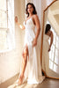 Embrace the epitome of understated glamour with the Cinderella Divine CD903W gown. Crafted from luxurious satin, this dress exudes timeless beauty and sophistication. The sleeveless design features a deep V-neckline and a pleated bodice, creating an effortlessly elegant silhouette. Spaghetti straps provide delicate support, while the fitted bodice is completed with a convenient back zipper closure. From the waist, the A-line skirt flows gracefully, ensuring both movement and comfort. A high leg slit adds a touch of allure, while the sweep train adds a hint of drama as you glide through the event. Cinderella Divine CD903W embodies the perfect balance of classic and refined style, making it the ideal choice for those who appreciate understated glamour.
