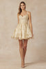 Indulge in the ethereal beauty of this Luxe Label short dress, adorned with intricate gold embroidery that dances across its swirling patterns. The A-line silhouette flatters all body types, while the V-neckline adds a touch of sophistication. The lightweight fabric ensures a comfortable fit, making it perfect for any special occasion. The concealed back zipper provides a seamless finish, allowing you to move with grace and confidence. Whether you're a guest at a wedding, attending a formal event, or simply looking for a stunning outfit for a special evening, this dress will turn heads wherever you go.
