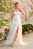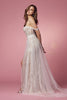 Embrace the epitome of romance with the Nox Anabel E441 gown. This masterpiece is meticulously crafted to enhance your natural beauty, featuring corset boning that cinches your waist and intricate lace appliques that cascade down the silhouette. The off-the-shoulder neckline frames your décolletage, while the sheer back adds a touch of allure. The exquisite overskirt flows gracefully into a captivating train, creating a breathtaking focal point. The sheath skirt exudes timeless elegance, culminating in a daring high slit that adds a touch of drama to your wedding ensemble. Whether you're walking down the aisle or gracing a red carpet, this gown will ensure you make an unforgettable statement.