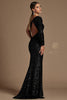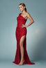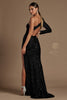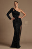 The alluring asymmetrical neckline draws the eye, complemented by a captivating cutout accent on one shoulder. The long sleeve and boldly cutout back add an air of sophistication, while the sheath skirt gracefully cascades into a high slit that seamlessly extends into a trailing train.