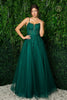 Embark on an unforgettable evening as you don the enchanting Nox Anabel T449 gown. This exquisite long dress exudes elegance and grace, featuring a flattering scoop neckline that highlights the corset-style bodice. The see-through bodice is adorned with intricate embroidery, creating a captivating and ethereal effect. The A-line silhouette flows effortlessly from the waist, crafted from delicate tulle that shimmers with every movement. With its timeless and regal aura, this gown will make you feel like a princess on your special night.