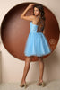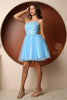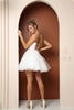 Command attention wherever you go with the enchanting Nox Anabel T718 short dress. Its alluring sleeveless bodice and wide scoop neckline, held by delicate spaghetti straps, create a striking entrance. The crisscross lace-up tie design adds a touch of allure to the open back. Intricate lace appliques embellish the bodice and flow seamlessly onto the sheer A-line silhouette skirt, which elegantly descends to a flattering short hemline. This Nox Anabel creation is the epitome of captivating style, perfect for any special occasion.