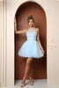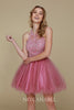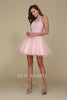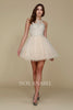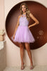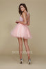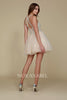 Step into the spotlight with Nox Anabel's B652 dress, a captivating masterpiece that embodies youthful exuberance. Its fit-and-flare silhouette flatters your figure, showcasing a sleeveless bodice adorned with intricate lace appliqués and sparkling rhinestone beads. The leafy lace beaded string adds a touch of elegance to the jewel neckline and frames the alluring caged back. The short flared skirt, crafted from layers of frothy tulle, moves gracefully with every step, ending in a playful rolled hemline that falls at mid-thigh length. Dance the night away or make a grand entrance in this sassy and stylish cocktail dress that will turn heads and leave an unforgettable impression.