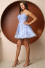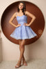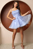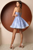 The ethereal tulle A-line skirt cascades gracefully to a mid-thigh hemline, creating a flattering and playful effect. The intricate lacework and shimmering accents catch the light, making you the center of attention wherever you go.