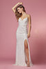 Indulge in the allure of high fashion with Nox Anabel's exquisite R1031W evening gown. This masterpiece is adorned with a cascade of shimmering sequins and intricate beadwork, creating an ethereal glow that will captivate all eyes. The sleeveless design features a flattering V-neckline and delicate spaghetti straps that provide support to the fitted bodice. The back is adorned with a lace-up closure that adds a touch of allure.