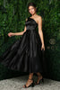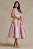 A slender set-on waistband cinches the waist perfectly, transitioning seamlessly into a flowing pleated A-line skirt. The tea-length hemline adds a touch of sophistication, while the intricate pleating creates a flattering silhouette.
