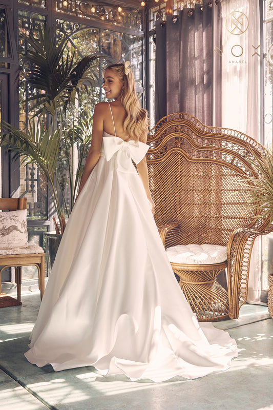 Radiate the timeless glow of everlasting love in this exquisite wedding gown by Nox Anabel. The modest paneled scoop bodice, meticulously crafted with triple seam lines, gracefully enhances the bust area. Embrace contemporary fashion with the alluring bare back, adorned with an oversized bow for a truly polished finish. The gown boasts a pleated A-line silhouette skirt that cascades in graceful folds, culminating in a sweeping train at the hemline. With the Nox Anabel JE968 wedding dress, step confidently into your grand entrance, ensuring that every moment is as breathtaking as you deserve.