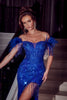 Prepare to captivate and leave an unforgettable impression in the captivating Portia and Scarlett PS23302 dress. Intricate beadwork adorns this slim-fitting gown, complemented by fringe accents that add an irresistible touch. The off-shoulder design boasts a sweetheart neckline, feathered cap sleeves, and a glamorous scoop open back. An enticing high leg slit enhances the sheath skirt, which flows gracefully into a full-length hem and sweeping train. Available in the stunning Cobalt color, this Portia and Scarlett masterpiece is sure to turn heads and make a lasting statement at any formal event or special occasion.