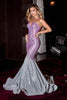 Embrace your inner diva in this beautifully tailored gown inspired by Portia and Scarlett. The exceptional design features dazzling beads on the fitted bodice, creating an eye-catching look that continues through the hips. The gown transitions into glittered fabric that produces an ombré effect from the knees downward, adding a touch of ethereal elegance. The strapless bodice showcases a sweetheart neckline with a deep sweetheart accent, accentuating your décolletage. The formfitting style continues from the hips down to the knees, where it then flares out into a stunning mermaid silhouette. The gown finishes with a dramatic sweep train, making a bold statement at your next special event. Available in Pink Ombre and Silver, this Portia and Scarlett gown is sure to turn heads and make you feel like the star of the night.