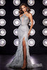 The embellished basque waist accentuates the curves, leading to a mesmerizing mermaid skirt that flows effortlessly. The feather-fringed slit adds a touch of allure, ensuring you turn heads wherever you go. Available in Pink and Silver, this Portia and Scarlett masterpiece is the perfect choice for any special occasion, leaving an unforgettable impression on all who behold it.