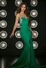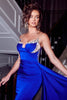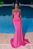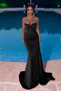Embrace the allure of a goddess in this enchanting Portia and Scarlett creation. Expertly tailored, this captivating gown features a plunging sweetheart neckline adorned with shimmering bejeweled trims. Delicate spaghetti straps add a touch of refinement, while the mermaid skirt sensuously hugs your curves.
