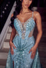 Prepare to captivate the spotlight in this mesmerizing Portia and Scarlett PS23352 gown. Its intricate cracked ice and rhinestone detailing shimmers and sparkles, creating an ethereal aura. The plunging V-neckline and delicate spaghetti straps exude elegance, while the sheer panel on the bust and illusion side cutouts add a touch of allure. The fitted sheath skirt gracefully falls to the floor, flowing into a sweeping train that adds a touch of drama. The A-line overskirt and high leg slit elevate the look, creating a combination of sophistication and sensuality. Step into this magical creation and make a majestic entrance that will leave an unforgettable impression. Available in a captivating Blue hue.