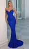 The Portia and Scarlett PS23385 dress is a breathtaking creation that exudes sophistication and glamour. Its strapless design and plunging neckline create a captivating décolletage, while the corset bodice with heatstone detailing adds a touch of opulence. The basque waistline cinches the figure, creating a flattering silhouette that is further enhanced by the flowing sheath skirt and trailing train. Available in a range of colors including Black, Cobalt, Hot Pink, and Red, this dress is sure to make a lasting impression on any occasion.