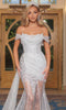 The off-the-shoulder scoop neckline and cap sleeves with clear spaghetti straps add a touch of sophistication, while the see-through mermaid skirt boasts a mesmerizing side drape that accentuates your natural waist. The flowing chapel train and scalloped hem add a touch of romance, making this dress perfect for those who desire to shine like a star. Embrace the allure of the Portia and Scarlett PS22971 dress, available in the captivating Ivory Silver color.