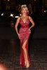 Step into the spotlight with the Portia and Scarlett PS23254 dress, a masterpiece designed to turn heads. Its exquisite silhouette is covered in shimmering sequins, ensuring you radiate brilliance throughout the night. The sleeveless bodice features delicate spaghetti straps, a sultry cowl neckline, and a captivating open back. The high leg slit and flowing train add an alluring touch of elegance, creating a dress that effortlessly embodies sophistication. Embrace your inner goddess in this stunning gown, available in vibrant Emerald and Red hues.