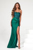 Indulge in the epitome of elegance with this captivating Portia and Scarlett long gown. Its strapless design accentuates your natural curves, while the intricately embellished bodice adds a touch of ethereal beauty. The delicate fringe accents dance gracefully with every movement, creating an alluring effect. The daring high slit reveals a hint of leg, adding a touch of allure.