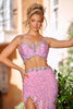 Step into the spotlight with this captivating gown by Portia and Scarlett. Its two-piece design features an exquisite beaded bodice that shimmers under the lights, while the tantalizing bare midriff adds a touch of allure. The skirt is adorned with a mesmerizing feather accent, creating a dramatic and unforgettable silhouette. A high front slit and sweeping train add an elegant touch, making you the center of attention wherever you go. Choose between the enchanting Pink or White AB variants and exude timeless beauty and sophistication on your special day.