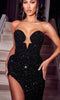 Experience the glamour of Hollywood in this exquisite Portia and Scarlett PS23709C dress. Its strapless and sleeveless design accentuates your shoulders and arms, while the sweetheart neckline with a nude inset adds a feminine and alluring touch. The dress is adorned with sparkling crystals that shimmer under the lights, making you the center of attention. A side slit provides both sexiness and ease of movement, and the sweep train creates a dramatic and unforgettable effect. Available in a captivating shade of black, this dress will make you feel like a true goddess.